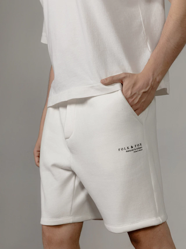 Peça confeccionada em algodão com 410g de gramatura e modelagem relaxed fit. Apresenta caimento estruturado, interior felpado e cós com elástico. Possui bolsos laterais e traseiro. Estampa em silk digital abaixo do bolso lateral.