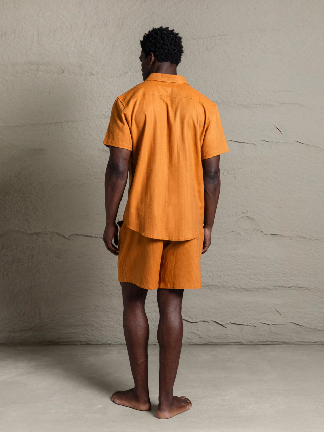 Conjunto composto por camisa manga curta e bermuda. Confeccionado em diferentes fibras, entre elas linho, viscose e algodão certificado. 230g de gramatura. A base do material proporciona toque texturizado rústico e design minimalista. Caimento leve e versátil. Camisa com gola italiana e fecho à frente com botões da mesma cor do tecido. 2 bolsos frontais na camisa. 2 bolsos laterais e 1 bolso traseiro na bermuda. Composição: 50% algodão | 30% viscose | 20% linho