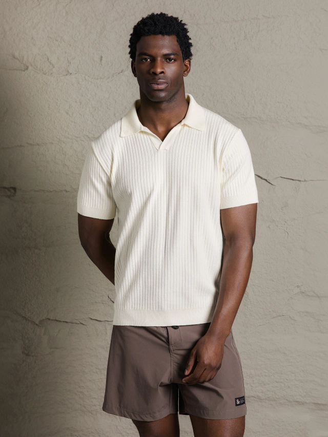 A Polo tricot canelada é confeccionada em modal turim, oferecendo conforto e leveza. Com uma textura sofisticada e um design minimalista, ela se destaca pela sua versatilidade e toque macio.